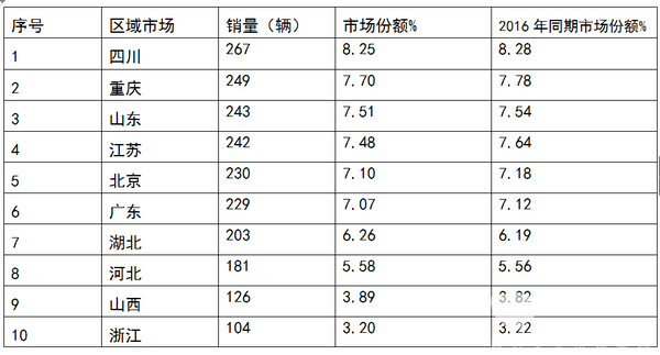1、2017年上半年前15名主流区域市场的LNG客车销量集中度为77.82%,比2016年同期的77.88%稍微有所降低,说明LNG客车资源有重点区域市场倾斜的力度总体变化不大,呈现稳中微降态势。