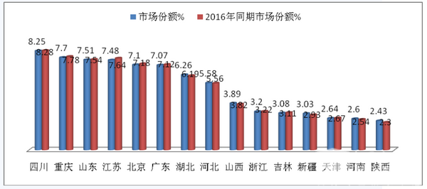 特点四、各区域市场销售流向分布不均,天然气资源丰富地区销量占有绝对优势,但这种优势地位稍有减弱的迹象,前15名区域市场集中度与2016年同期稳中微降,传统的强势区域地位正在受到挑战
