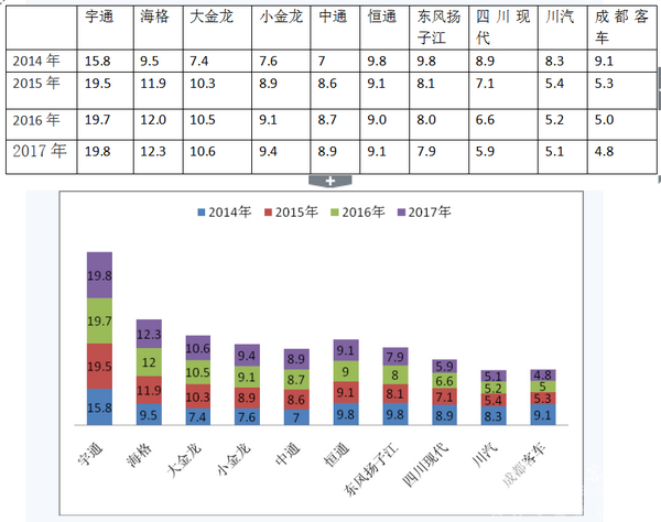 2014年,位居销量前5位的LNG燃气客车生产企业依次是宇通、恒通、东风扬子江、海格客车、四川现代等,这五家企业中LNG客车年销量份额最少都在10%左右。2017年,位居销量前5位的LNG燃气客车生产企业次序悄然发生变化,客车老大宇通位仍然稳居第一位,海格、大金龙、小金龙、中通等客车行业的主流企业LNG客车的销量比例位次均比上年明显提升。而东风扬子江、四川现代等位次逐步被拉后,可见,主流企业LNG客车市场份额占据主导地位,传统优势的LNG客车企业正在逐步被边缘化