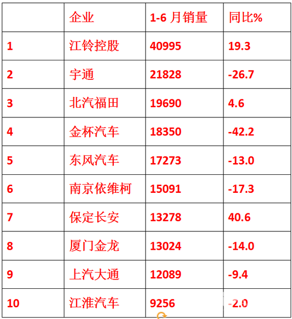1、10家主流客车企业中,江铃控股销量最大,也是同比增长第二大大的企业