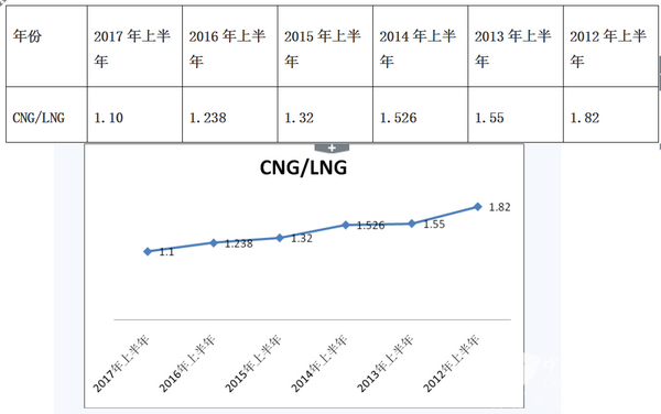 近6年上半年CNG客车与LNG客车的销量比值从2012年的1.82逐年下降到2017年的1.10,充分说明近6年的燃气类客车市场在发展过程中,CNG的发展速度相对LNG来说较为缓慢,换句话说,目前燃气类客车产品由CNG客车向LNG客车加速过渡,构成 NG类客车的市场结构比例正在发生改变。