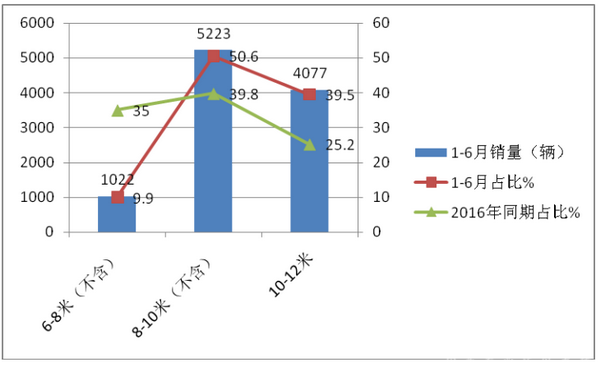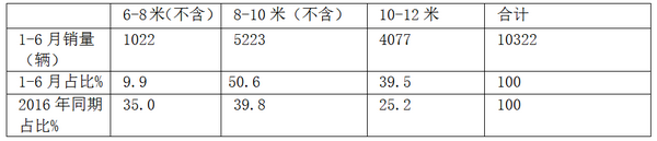 1、2017年1-6月纯电动客车8-10米区间销量最大,占比超过50%,同比权重增加了10.8个百分点。