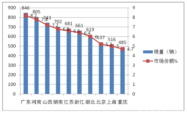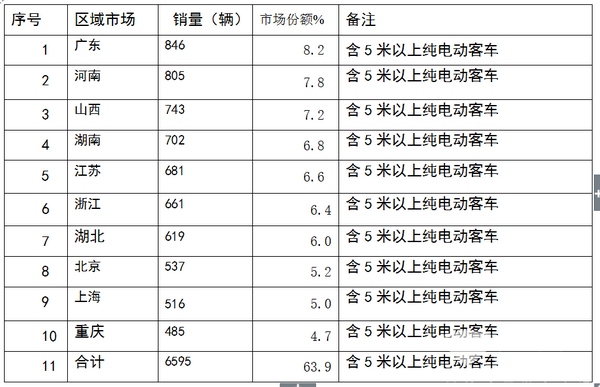 从上图表分析,2017年上半年纯电动客车市场销量分布不平衡,广东、河南、山西、湖南、江苏等成为纯电动客车的主要市场。前10名区域市场集中度达到63.9%。