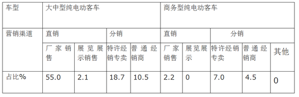 从上表可知,直销的主要是大中型客车占据权重为59%,而商务车车型,主要依靠分销,可见,2017年上半年纯电动客车的营销渠道与车型及目标用途密厂家直销比重很小(只有2.2%),因此可以说,纯电动客车的营销渠道与车型和用途密切关联。