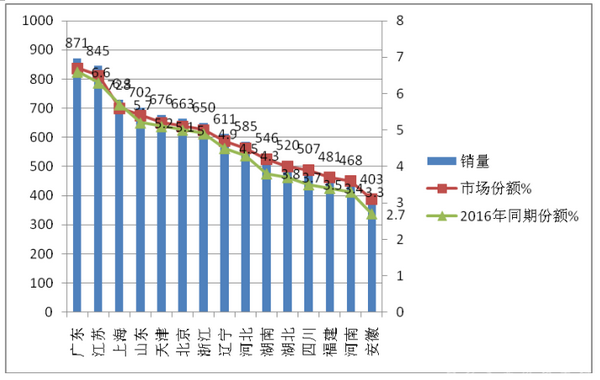 2、团体车销量最大的区域市场是目前中国华南的广东,占有的市场集中度为6.7%,这主要与该区域经济较好、工厂和外资企业及高校比较多、上班的员工路途较远有关,因此需求接送职工上下班和租赁用的团体车用量就很大,这是促使该区域团体车市场发展的客观市场环境所致,但市场份额比去年同期提高0.1个百分点。第二和第三分别是江苏和上海,市场集中度比2016年同期均有不同程度的提高和下降。