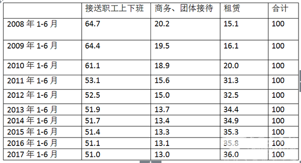 1、对所在的众多行业购买团体客车用途进行调研,可以看出接送职工上下班始终是团体车最大的目标市场,这部分主要是企业和机关自己用来作为职工上下班的交通工具,主要是改善职工的福利。占据团体客车总销量的比例最大,但近10年来这种比例正在逐步呈现下滑趋势。