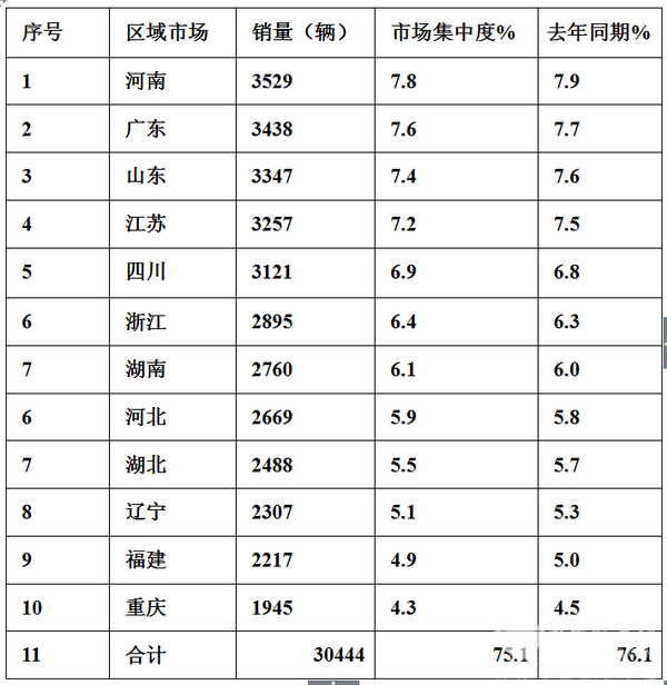 从上述数据分析可知,2017年上半年前10个重点区域市场的市场集中度为75.1%,同比下降1个百分点,说明垄断程度减弱。且河南、广东、山东、江苏四个重点市场的集中度都在7%以上,是2017年上半年大中型公路客车的主要阵营,但同比均有不同程度下降。