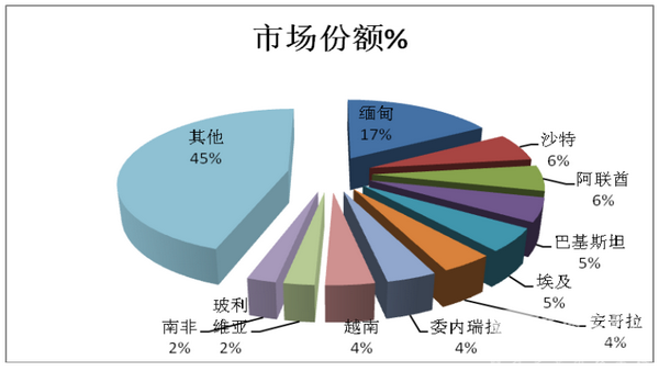 上图表表明:2017年上半年大中型客车出口国家中,缅甸数量最多,占据的份额达到近17%,且增幅最大。出口前10个国家中,2个同比下降,8个同比上升。