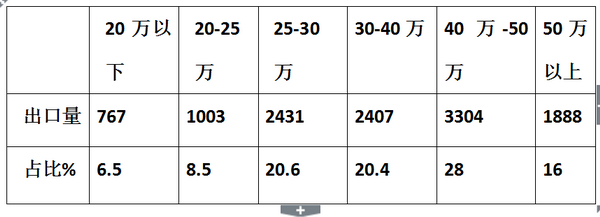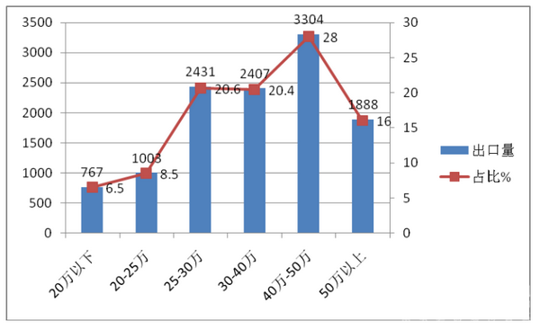 1、2017年1-6月大中型客车出口量在30万以上的价格中,占据到64.4%的市场比例,是大中型客车出口的主打车型。