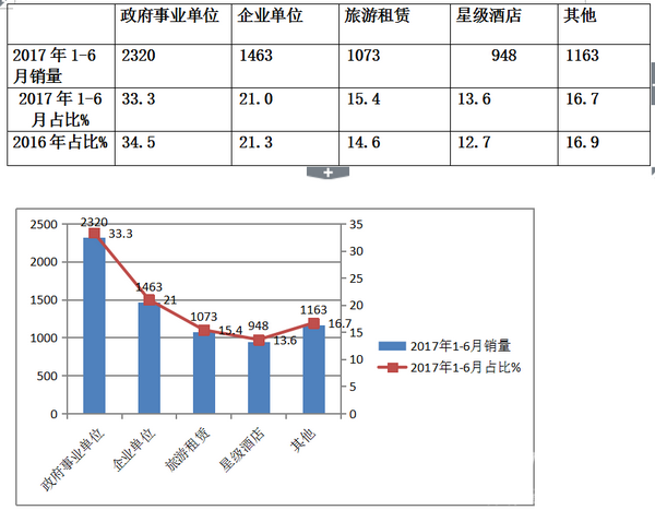 1.政府、事业单位:市、县级政府、公检法司、教育、文化、体育、新闻、广播影视、交通、卫生、水利等事业单位用于接待、出行用车,占市场33.3%,比2016年同期下降了1.2个百分点。