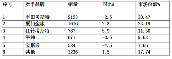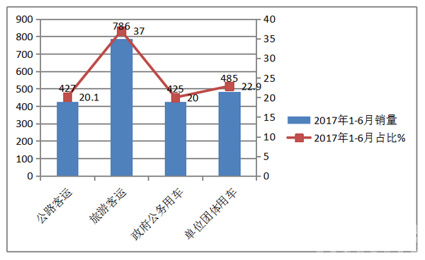 根据权威数据统计,2017年1-6月考斯特客车累计销售6967辆,同比增长1.44%,按目标用途划分,销量结构表:表1