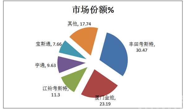 三、 丰田考斯特占据的市场份额最大,其次是厦门金旅,再次是江铃—对2017年上半年考斯特客车主要竞争对手销量及份额分析。