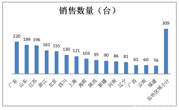 高端考斯特销量的大哥大----一汽丰田柯斯达2017年1-6月累计销量为2123台,比2016年同期下降2.5%,主要分布区域市场在广东、江苏、北京、山东、浙江、四川、上海等区域。主要目标客户群体是旅游客运和政府公务用车;价格在40-50万是其销量比例最大的价格区间。