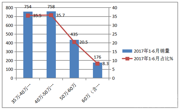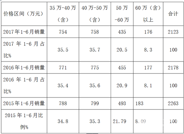 2、按价格划分,丰田考斯特2017年1-6月销量结构:
