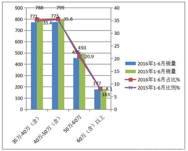 从上分析可以看出:丰田柯斯达价格在40-50万之间的产品销量比例最大,其次是30-40万的价格区间;60万以上的高档销售比例最小。同比,50万以下市场微弱上升,50-60万下降,60万以稳中微升。