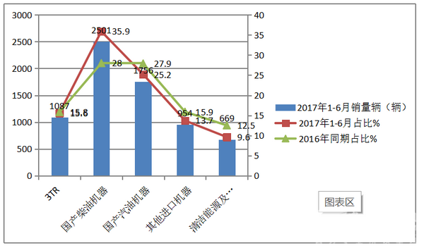 图标数据表明,2017年上半年,柴油同比占比上升,清洁能源及新能源同比下降,国产汽油机和其他进口机器也下降。