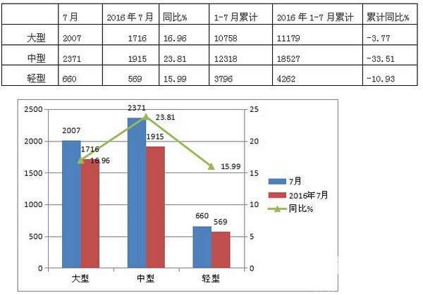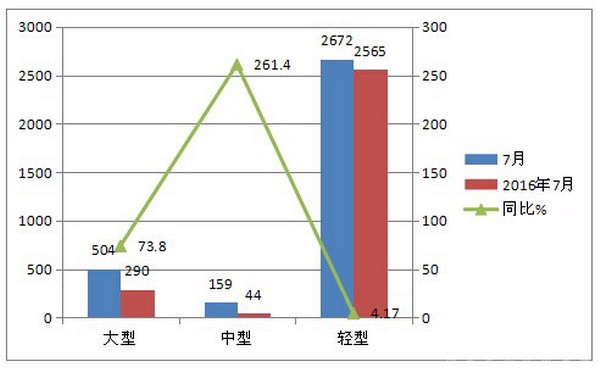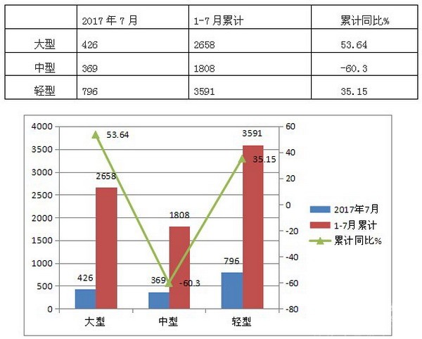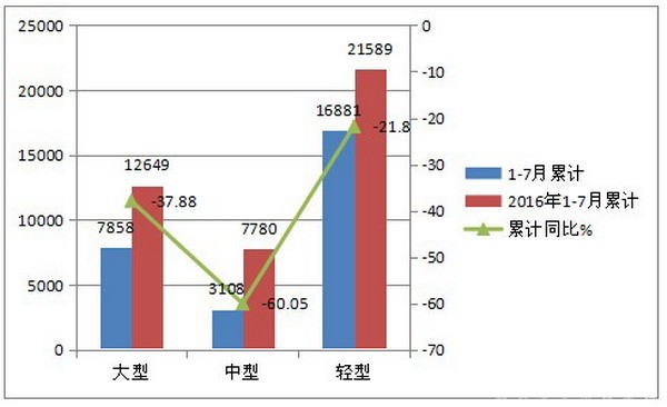 2、 1-7月轻型客车销量最大,增幅也较大。