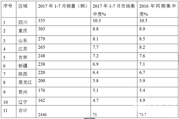 1、2017年1-7月全国重点10个区域市场 的CNG客车销量为2446辆,占据总销量3445辆的71%,说明CNG客车销量流向分布极不平衡,但比2016年下降近2.7个百分点(2016年7月是73.7%),说明这个不平衡在减小。