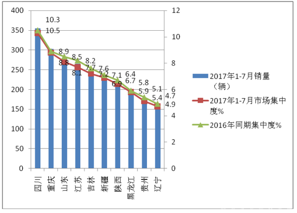2、前10名销量中,大西南的四川、重庆销量居于第一、第二,主要是由于大西南天然气资源丰富,为销售CNG客车提供了得天独厚的条件,但同比均下降。