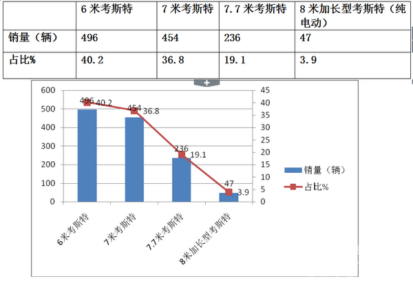 1、6米考斯特客车销量占比最大,达到40.2%,主要目标市场是小型商用车市场、城乡公交市场、小型旅游包车市场、中短途客运市场等。