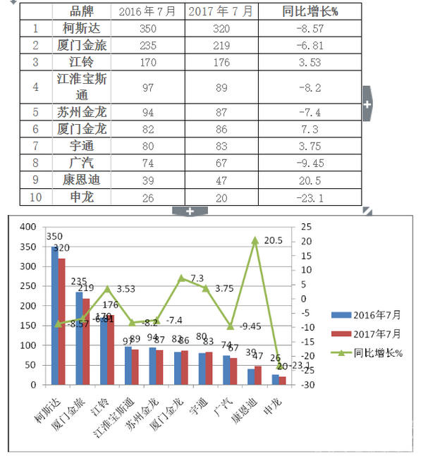 1、 自主品牌中厦门金旅表现尚可,2017年7月累计销售219辆,与去年同期相比增长下降6.81%,销量仍然是国产品牌中最大。