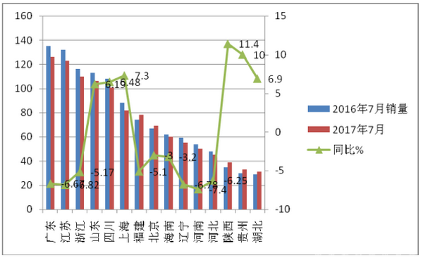 4、2017年7月各区域市场销量增幅统计%(来源上牌数据)