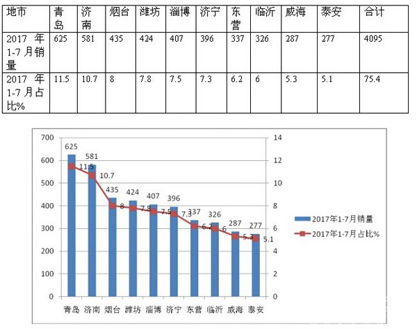 特点四、各地市销量分布不平衡,青岛、济南、烟台三区域销量集中度占据全省的30.2%,前10个地市共计销售4095辆,占据山东75.4%的市场份额,其余7个地市只有25%不到的份额