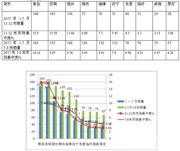 6、11-12米大型客车销量主要集中在青岛、济南、烟台等城市;而7-8米除了集中在青岛、济南几烟台等区域外,还主要集中在潍坊、淄博、临沂等区域,且11-12米在青岛、济南、烟台等前三个地市的集中度大于7-8米车型的集中度,其余排名在第四到第十的7个区域市场中则是7-8米集中度大于或小于11-12米市场集中度,这给大中型客车企业用什么样的车型主打什么样的市场提供了具体的参考依据。