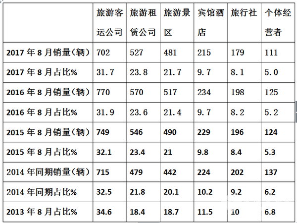 按目标客户行业划分,2017年8月及近两年同期旅游客车销量结构统计表,表1