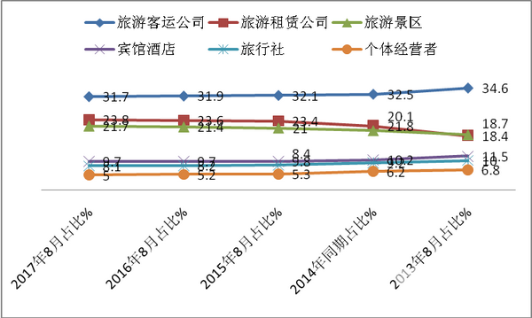 4、宾馆酒店、旅行社、个体经营者分别位居第四、第五、第六,且同比2016年、2015年8月均有不同程度的下降趋势,近5年也是呈现逐年稳中有降态势。