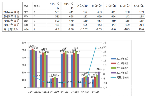 1、大型旅游客车增减情况分析。11-12米大型旅游客车2017年8月销量最大,同比下降2.2%,为下降幅度最小的长度段。10-11米同比下降8.56%,9-10米同比下降10.07%。