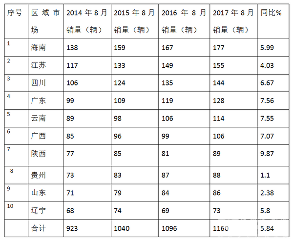 1、2017年 8月在全国销量位于前10名旅游客车市场的海南、江苏、四川、广东、云南、广西、陕西、贵州、山东、辽宁等10个区域市场中,共销售了1160辆旅游客车,占据了8月份旅游客车52.3%的市场份额,而2016年8月只有45.4%的市场份额,集中度提高了6.9个百分点,集中度明显加强。这说明一方面旅游客车市场不可能象高档客车那样集中度那么高,相反,旅游客车市场的集中度不高说明全国的各个市场对旅游客车来说都有机会,这也进一步证明了旅游客车产品为什么每个客车厂家都有销售,每个区域市场都能看到旅游客车在运营的主要原因了;另外一方面重点区域的垄断程度又在加强。
