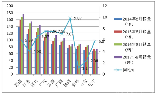 2、在前10个旅游市场中,海南是市场份额最大的旅游区域市场,主要因为该区域有三亚等著名的旅游休假城市,而且海南国际最大的旅游岛屿,销量同比上升5.99个百分点。 3、其次是江苏区域,是旅游客车销量第二大的区域,那里也是我国著名的旅游胜地不仅有六朝古都南京,还有无锡著名的三国城和苏州园林、苏北连云港的花果山等旅游胜地,旅游客车的销量2017年8月同比提高了4.03个百分点。是2017年8月主要区域市场中增幅幅度最大的市场。