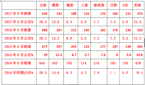 3、2017年8月份,锡柴和上柴的市场权重分别位居国产机器的第三、第四,但比康明斯的要低。且仔细研究发现,锡柴和上柴用在中型旅游客车车型上要相对多些,且同比基本持平,康明斯发动机车型权重上升了0.2个百分点。