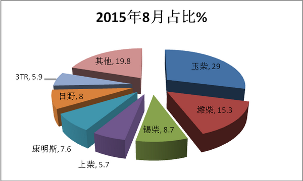 2、2017年8月份旅游客车销量中,潍柴机器占据的权重次大,达到15.0%,仔细分析,还可发现潍柴配置的主要是在10米以上大型旅游客车中,但同比也下降了0.2个百分点。
