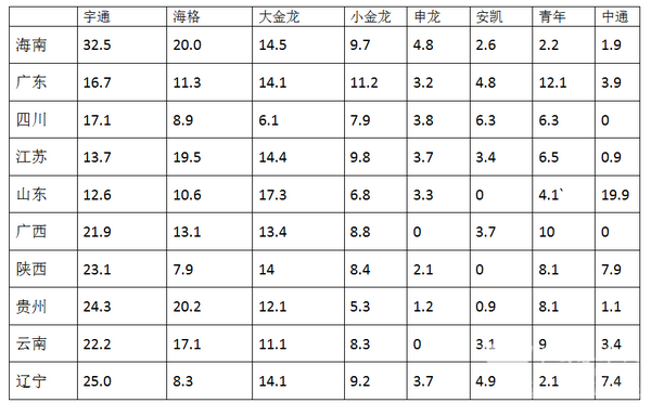 2、 在上述所列的10个主流区域市场中,作为第一旅游大市场的海南,垄断程度最高,旅游客车市场竞争最不充分,其中宇通市场份额接近三分之一,海格客车市场份额接近五分之一,大小金龙的市场份额也不低,可以说,海南旅游客车市场基本是三龙一通的天下。