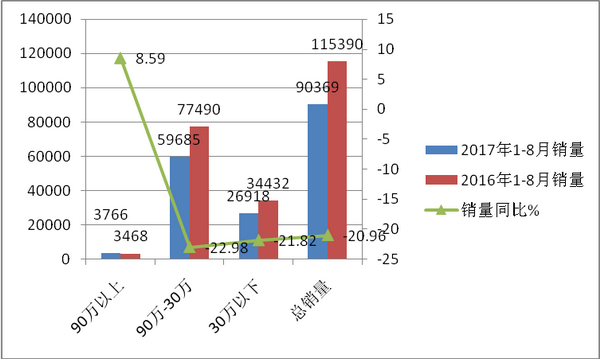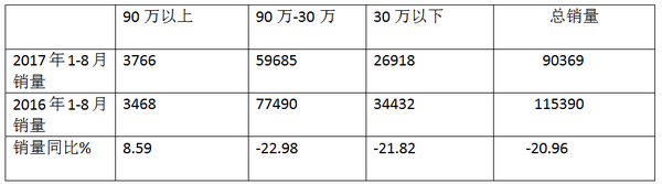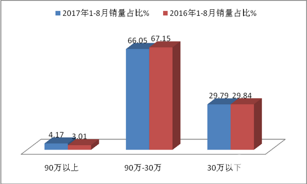 上图表表明,2017年1-8月30万以下客车权重同比基本稳定,只是微降了0.05个百分点。90万以上高档客车是权重唯一增长的价格细分市场。