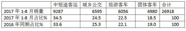 特点二:中短途客运是30万以下中低档客车市场的主要载体,其次是城乡公交;中短途客运权重同比在上升,城乡公交则相反---2017年1-8月30万以下客车市场按目标用途划分销量结构分析