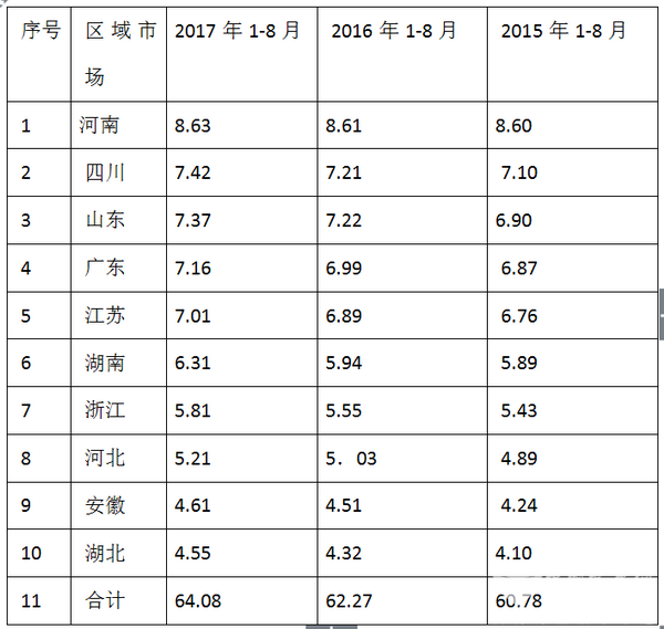 2、2017年1-8月销量前10名主流区域市场的30万以下中低档客车市场份额总和为64.08%,比2016年同期的62.24%提高了1.81个百分点,也就是说,中低档客车在主流区域市场的集中度提高了1.81个百分点,可见,中低档客车市场流向重点区域市场的趋势在加强。全国其他20多个区域市场的低档客车的市场集中度必然呈现下降趋势。