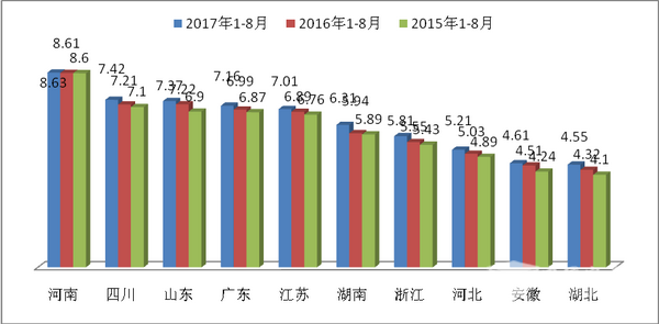 特点三:区域流向分布不均衡,市场份额比较高的均是在全国人口相对密集度较高的大省,且这种趋势有加强迹象;河南、四川、山东占据前三位-----对2017年1-8月30万以下客车区域流向及市场集中度分析在30万以下的低档客车市场份额与去年同期比较统计(表4,%):