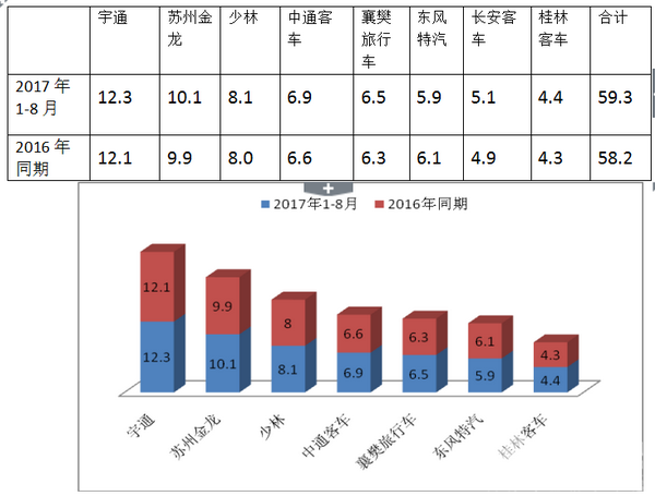 2、在前8名主流企业中,宇通客车依然是独占鳌头,占据了12.3%的市场份额,且比2016年同期提高了0.2个百分点,主要是因为宇通客车的校车市场独占鳌头,且校车大部分价格都在30万以下。