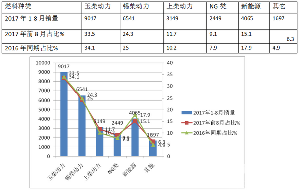 特点五、玉柴机器是主打动力,但市场份额同比有下降迹象,其次是锡柴,再次是上柴;NG类(含LNG、CNG)有上升态势,新能源客车有下降迹象----按动力种类划分分析2017年1-8月30万以下客车市场.
