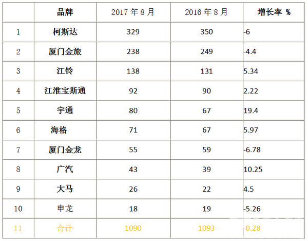 2017年8月各主流考斯特品牌销量统计表(来自最新上牌数据)