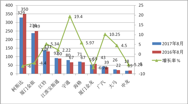 2017年8月份小金龙考斯特车型单月销售238台,同比下降4.4%,是国产考斯特品牌中销量最大的企业