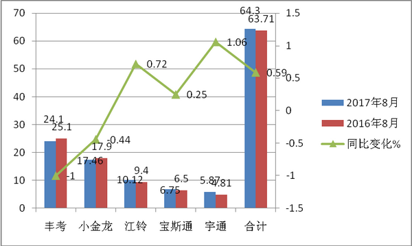 1、丰田考斯特2017年8月销量同比有所下降,幅度虽然不大,目前仍然是占据同类产品中最大的市场份额的品牌,占据的市场份额为24.1%,同比(2016年市场占有率为25.1)下降了近1个百分点。
