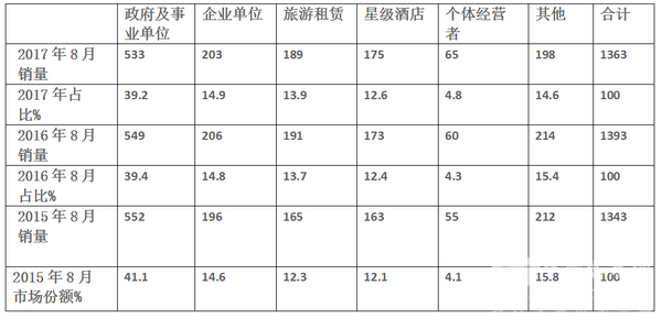 按照目标市场用途划分,2017年8月及2016年、2015年同期比较各细分市场的销量及市场份额如下表: