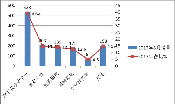 二、政府及事业单位是最大购买者,但权重同比微降-----按目标市场划分,对2017年8月考斯特客车销售数数据分析