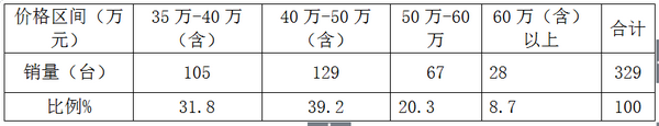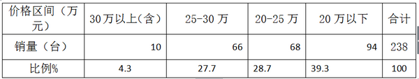 从上分析可以看出:丰田柯斯达价格在40-50万之间的产品销量比例最大,其次是30-40万的价格区间;60万以上的高档销售比例最小。