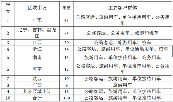(二)、江铃考斯特:江铃考斯特2017年8月销量138台,同比增长5.34%,销售区域在广东、东北、江西、浙江等区域市场,目标客户群体主要是旅游客运和公路客运。