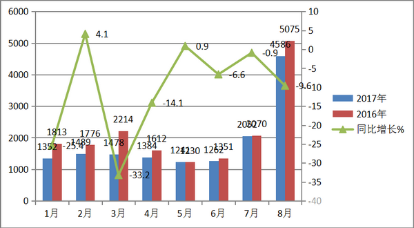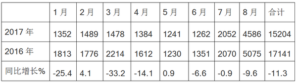 2、前8月中,8月销量最大----2017年1-8月各月校车市场销量及同比情况